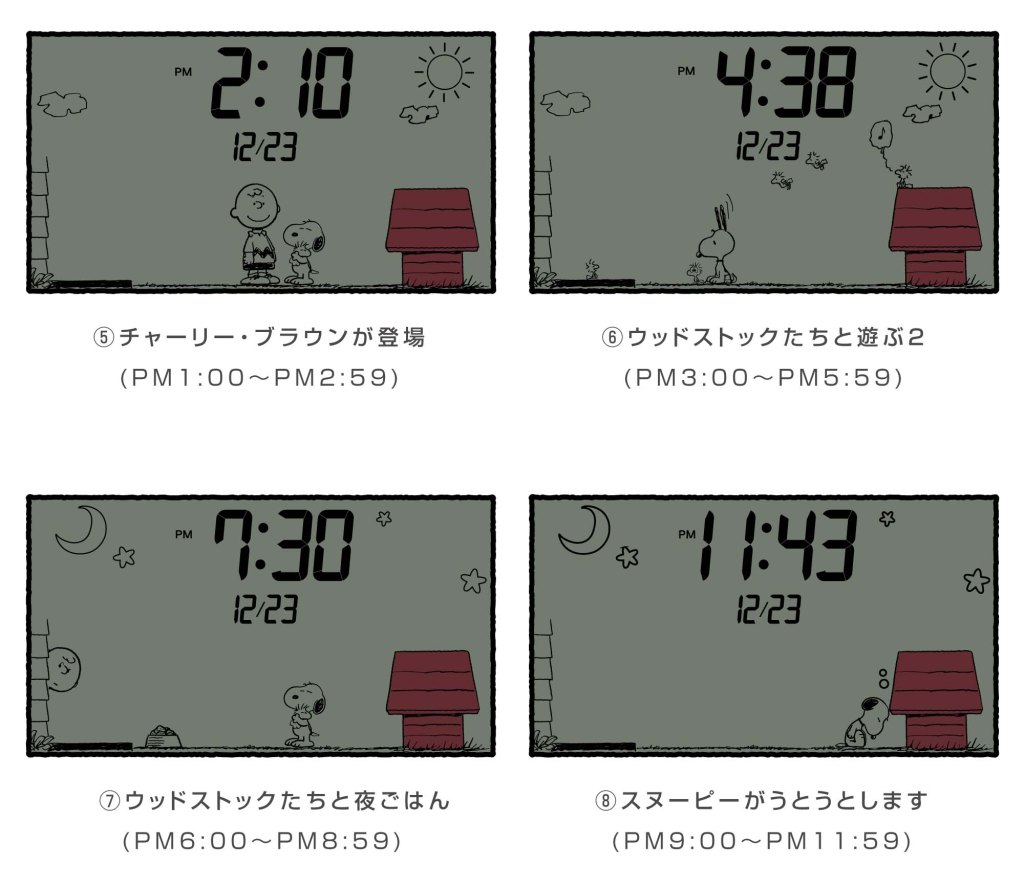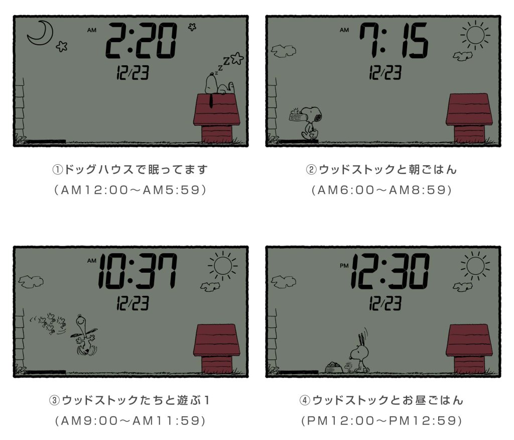 デジタル時計ならでは!全部で14種類のデジタルアニメーションが流れます。 実際の時間に対応したアニメーションになっているほか、特別日限定のアニメーションもあるので、1年中楽しめます!